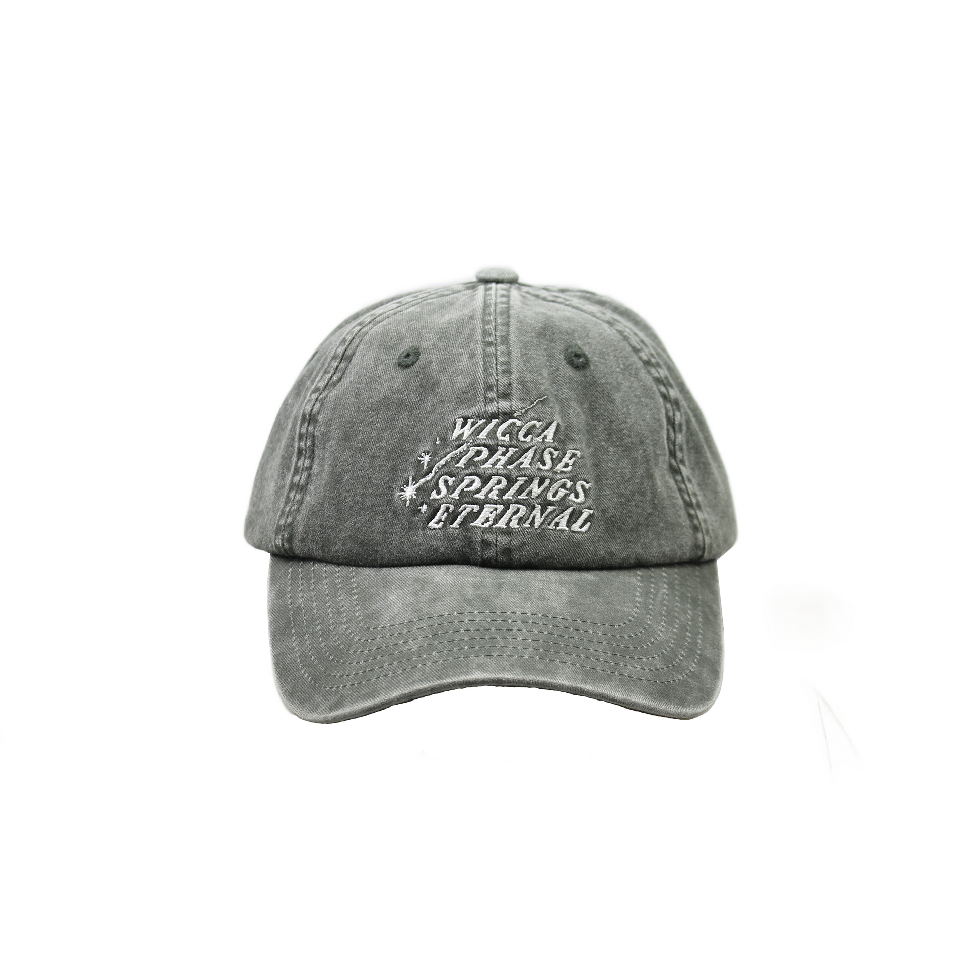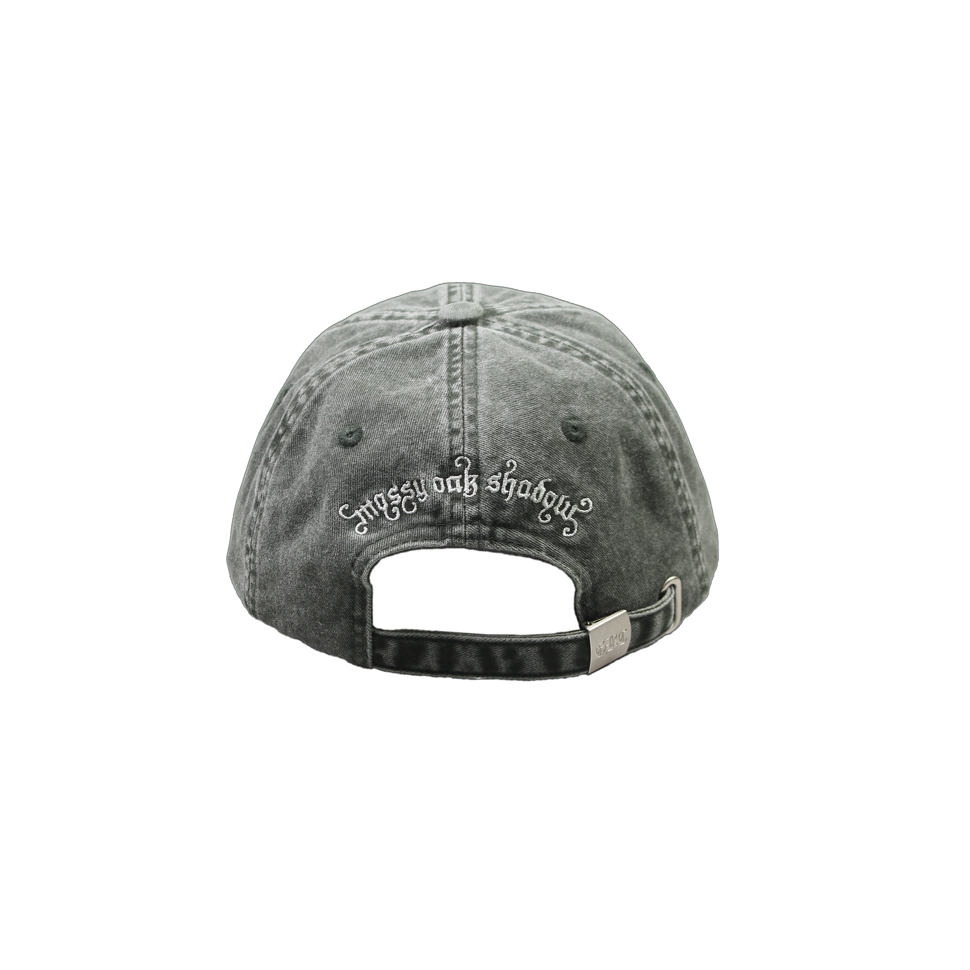 Garment-dyed, six-panel, unstructured dad hat in washed black with embroidered front/back designs.